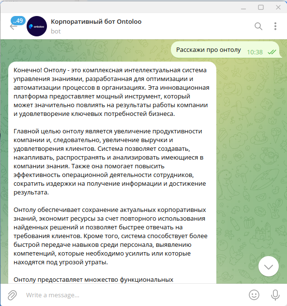 Мы используем векторные базы данных для интеллектуального поиска ответа, что делает доступным для чат-бота все корпоративные знания. Доступ к данным можно регулировать с помощью гибких групповых политик. Найденные документы добавляются к промту с инструкциями и с запросом пользователя поступают в GPT модель на выбор: ChatGPT, Gemini, Claude, Yandex GPT или любую другую, развернутую на собственных серверах. Общение с чат-ботом возможно через любые каналы: корпоративный портал, интернет-магазин, Телеграм (ТГ) и другие мессенджеры.